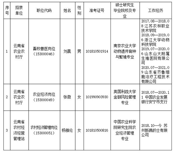 根据《中华人民共和国公务员法》《公务员录用规定》《云南省公务员录用实施办法(试行)》和有关法律法规,按照云南省2021年度考试录用公务员有关规定,经笔试、面试、资格复审、体检、考察等程序,现将云南省农业农村厅2021年度考试录用公务员拟录用人员予以公示: