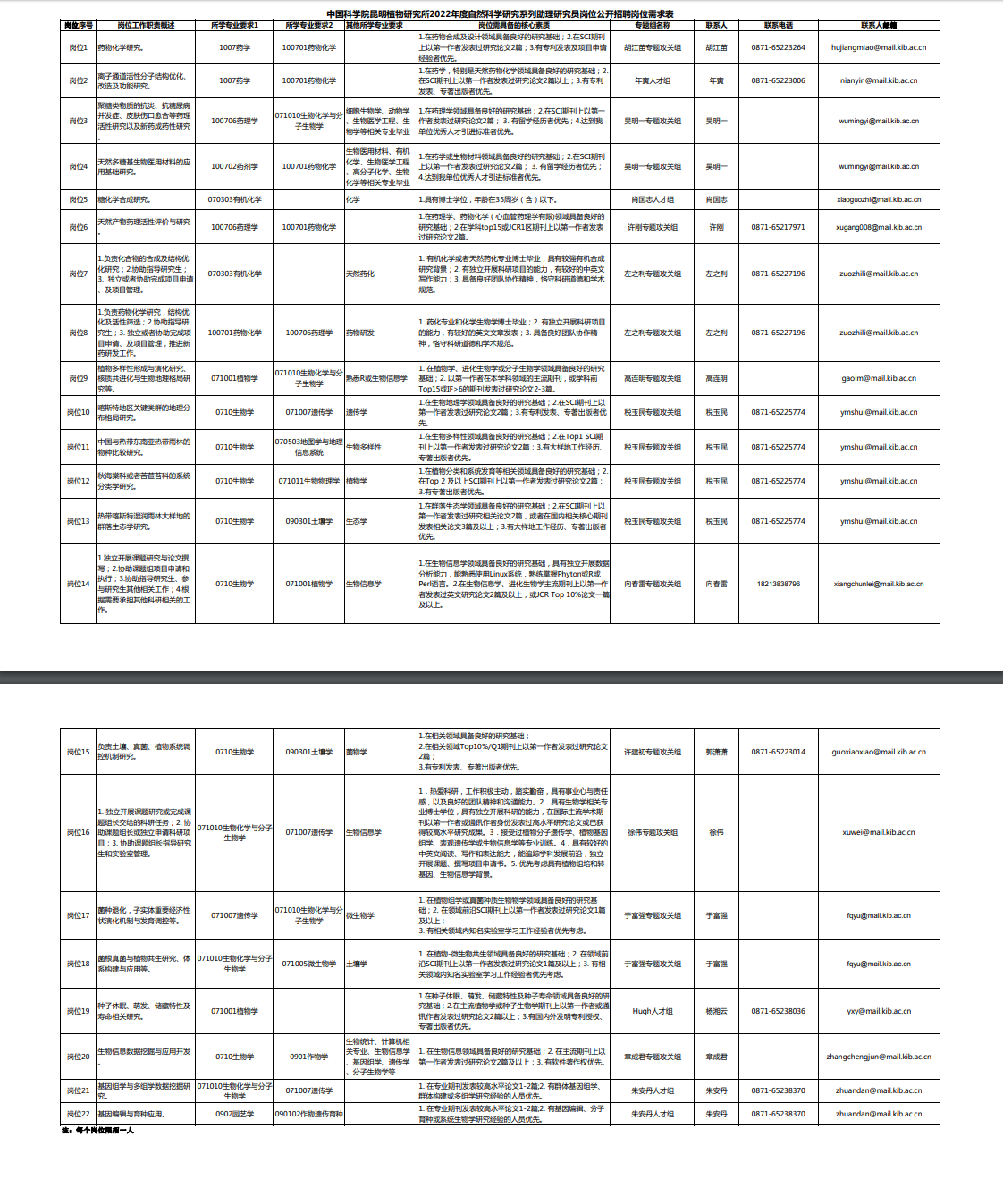 (一)招聘岗位,见附件《中国科学院昆明植物研究所2022年度自然科学研究系列助理研究员岗位公开招聘岗位需求表》。