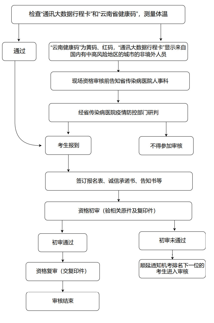 按照疫情防控要求,参加现场资格应主动申报个人健康状况,须于审核前3天提前申领本人“通讯大数据行程卡”和“云南健康码”。现场资格审核当天,考生应准时到场,进入审核前,考生须配合进行体温测量,出示“通讯大数据行程卡”和“云南健康码”登记记录,体温正常,且“通讯大数据行程卡”和“云南健康码”均为绿码人员,可正常进行现场资格审核。