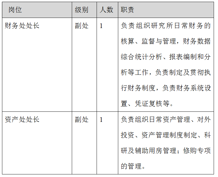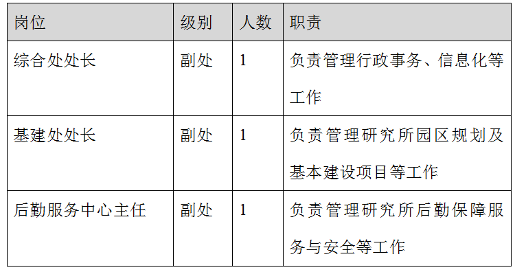 为建立一支精于管理、善于协调、勤于服务、敢于创新的专业化高素质管理队伍,本着“按需设岗、按岗聘用、竞争择优、合同管理”的原则,按照《党政领导干部选拔任用工作条例》、《中国科学院研究所中层领导人员选拔聘用和管理实施办法》、《中国科学院人员聘用制度实施办法》及研究所相关规定,现面向所内外公开招聘综合事务部、科研发展部、党群人事部、财务资产部副职,欢迎有志者报名。