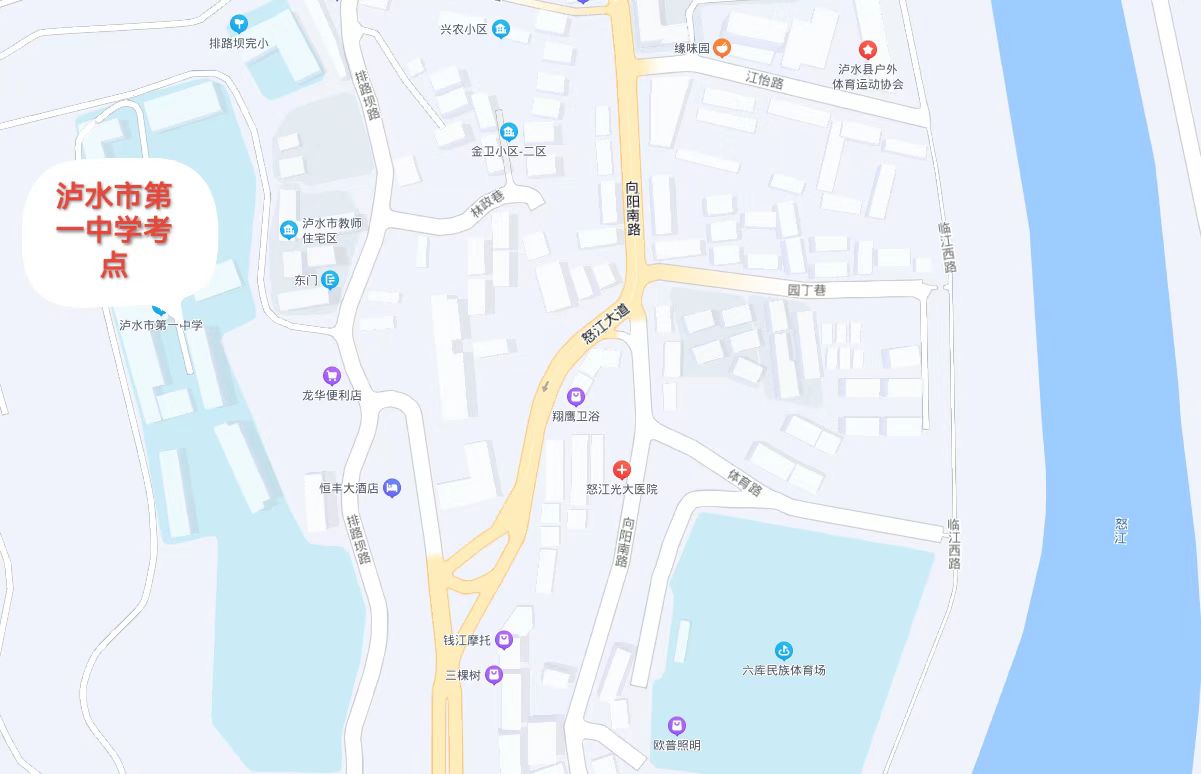 怒江考区共设有怒江州民族中学、泸水市第一中学、泸水市第一完全小学(新城校区)3个考点。考点学校具体地址及地图指南如下: