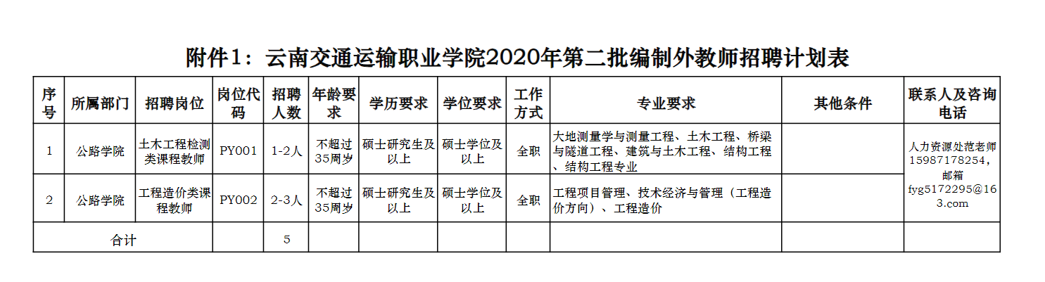 附件1:云南交通运输职业学院2020年第二批编制外教师招聘计划表