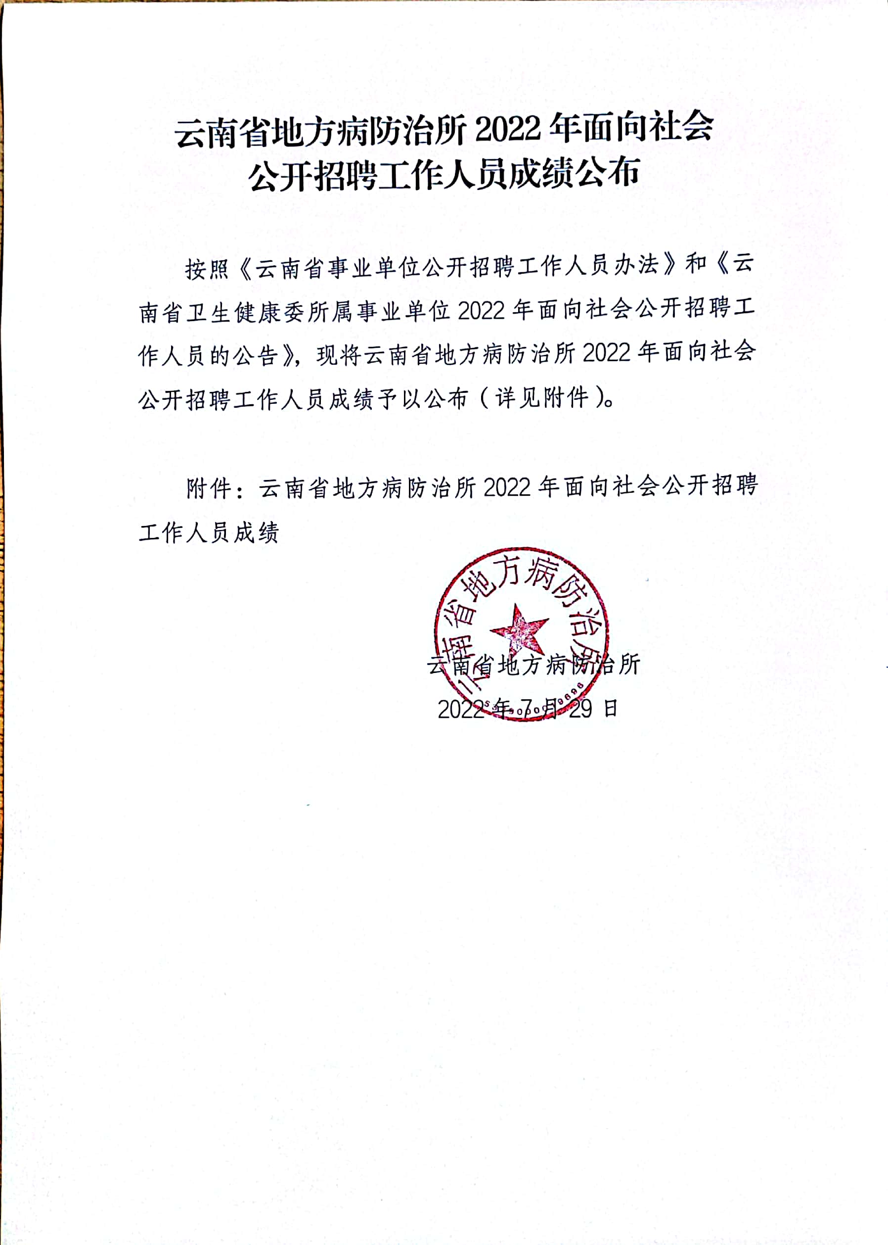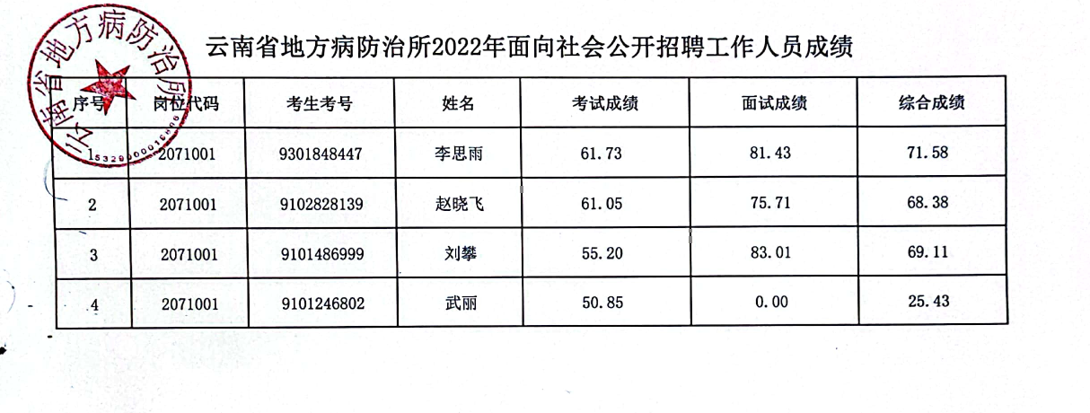 云南省地方病防治所2022年面向社会公开招聘工作人员成绩公布