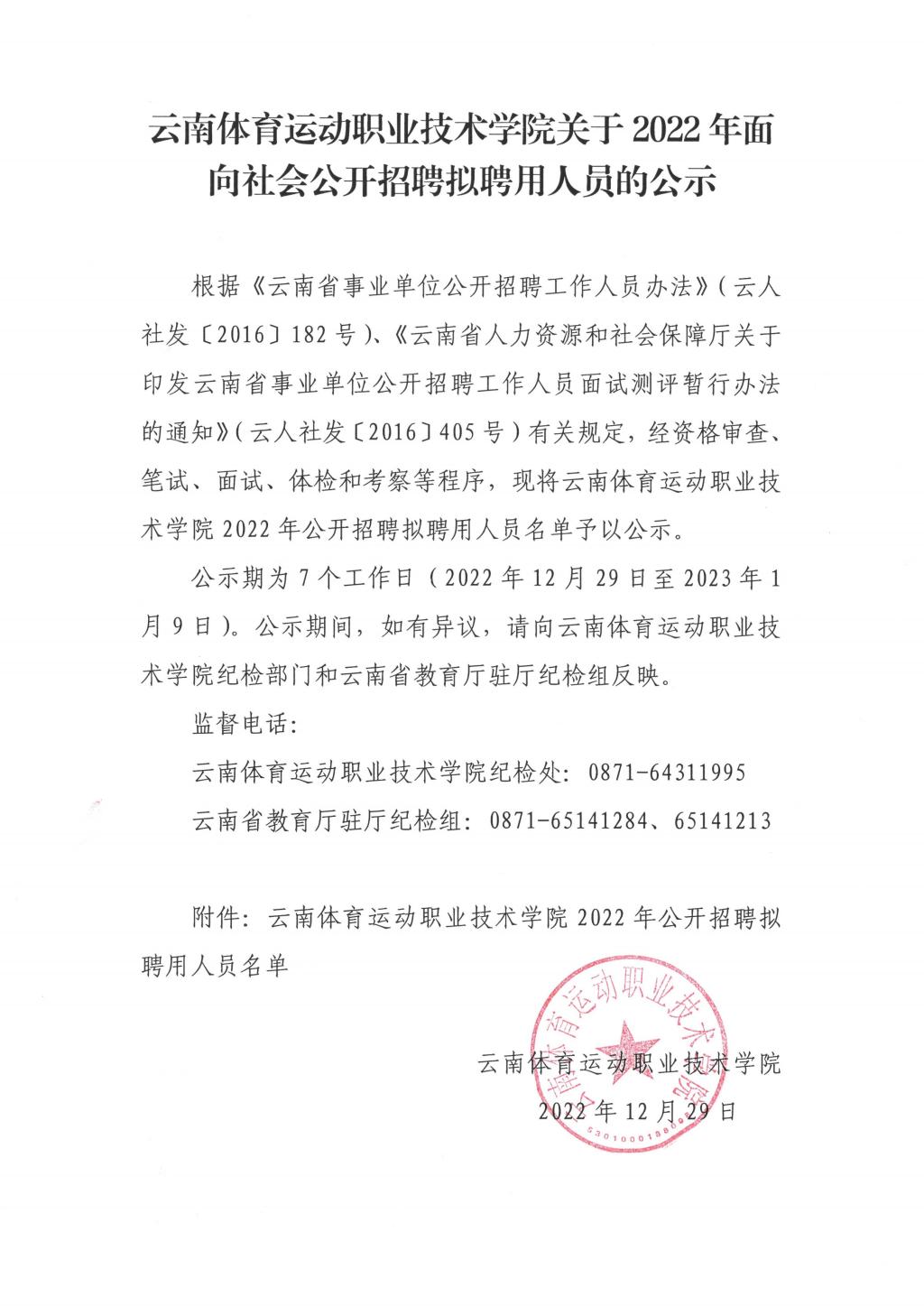 云南体育运动职业技术学院关于2022年面向社会公开招聘拟聘用人员的公示