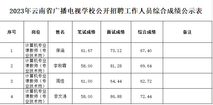 2023年云南省广播电视学校公开招聘工作人员综合成绩公示表