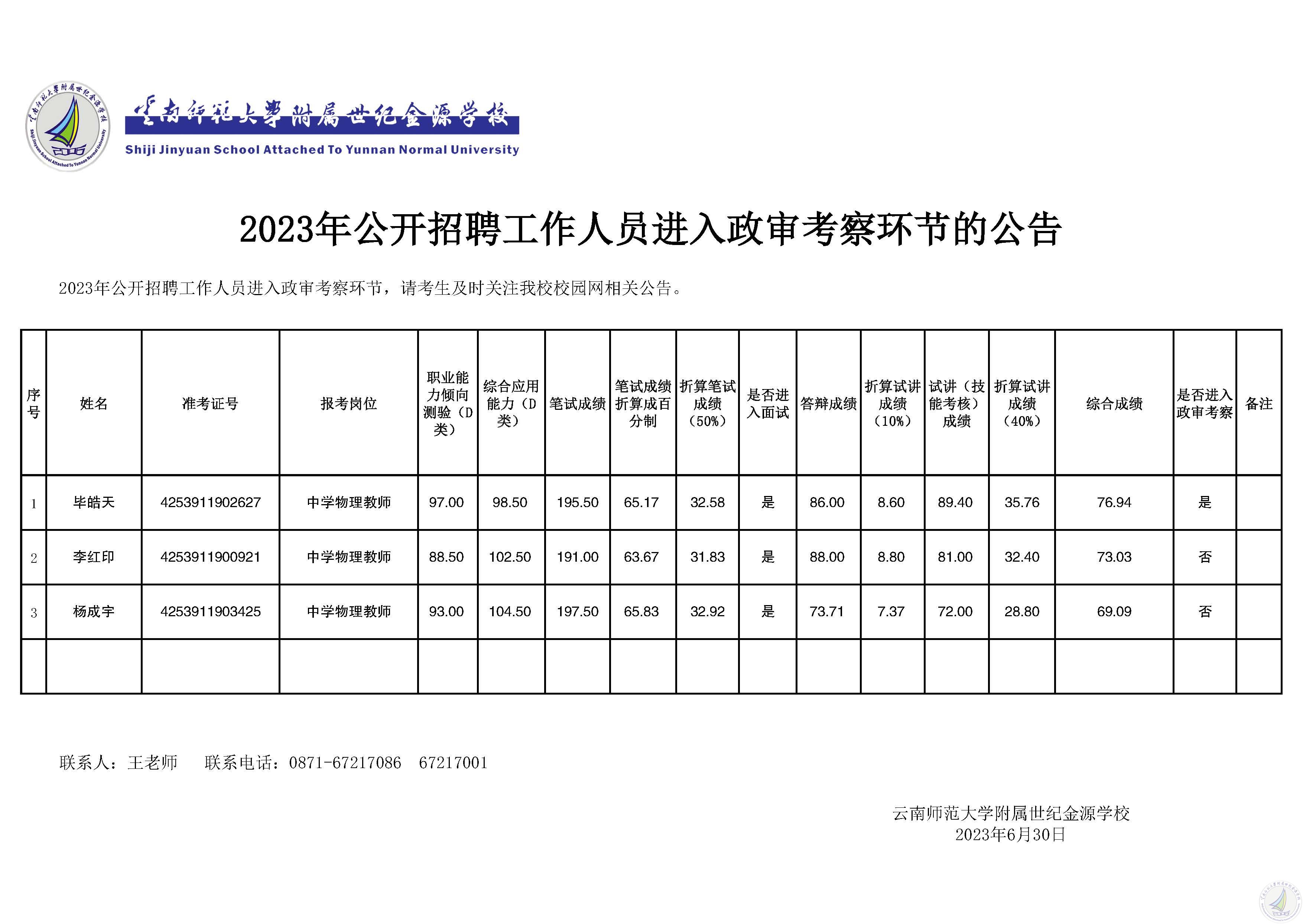 2023年云南师范大学附属世纪金源学校公开招聘工作人员进入政审考察环节的公告