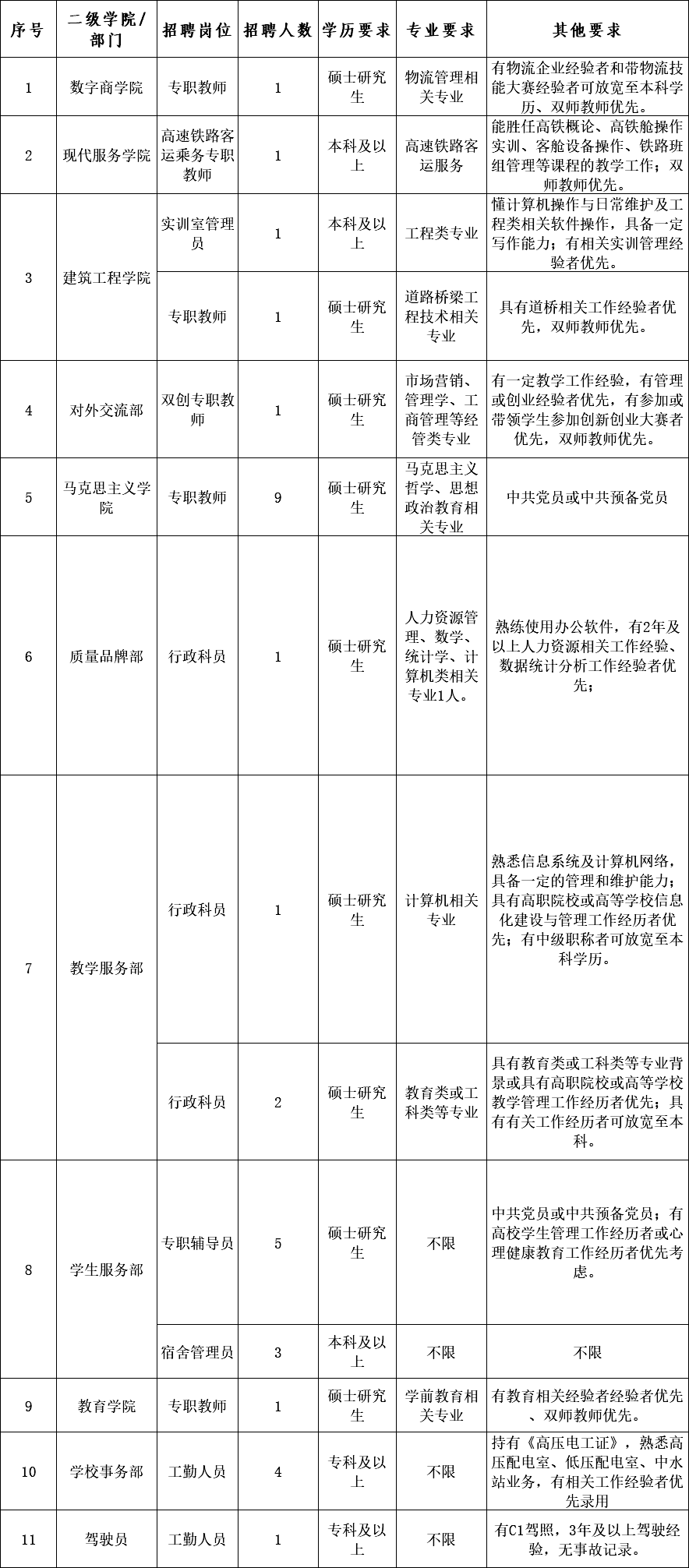 专职教师、专职辅导员、行政人员、教辅人员招聘需求