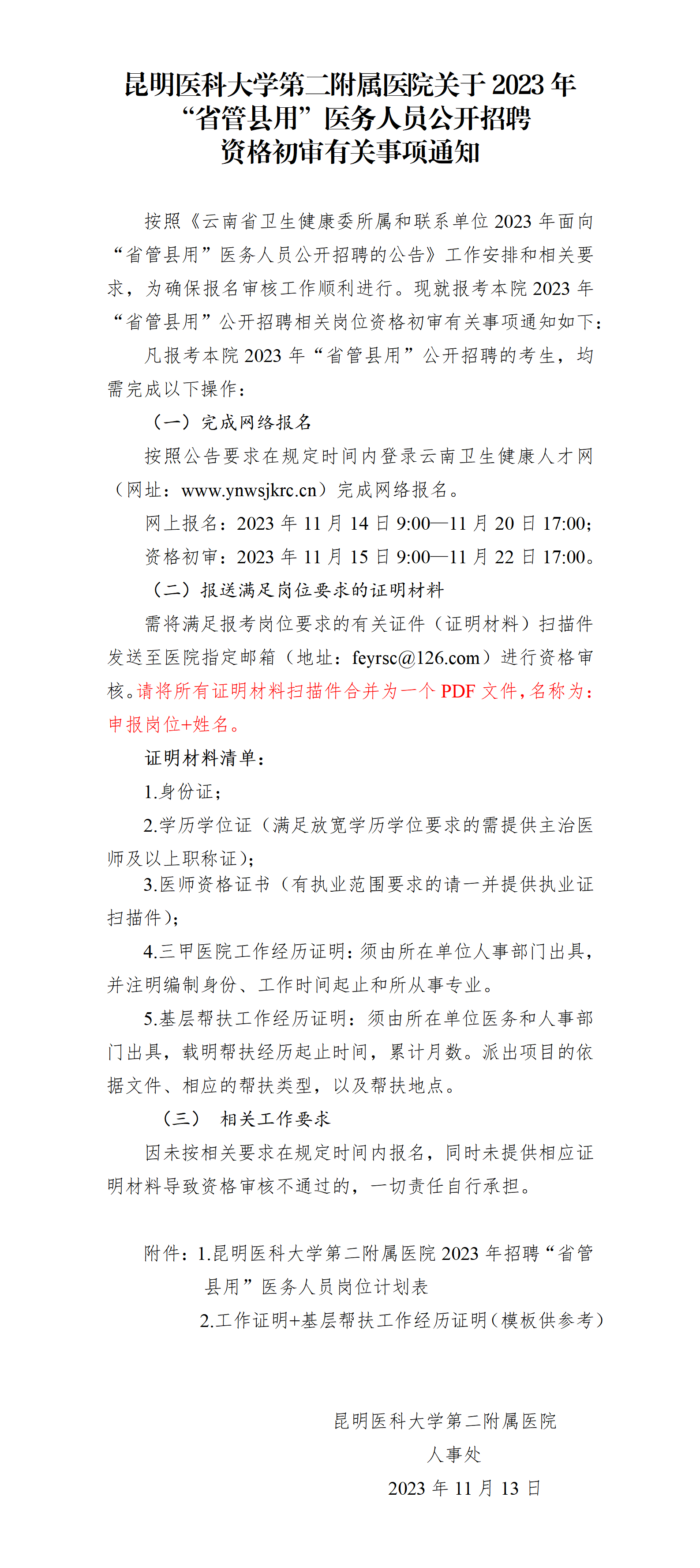 | 昆明医科大学第二附属医院2023年招聘“省管县用”医务人员岗位计划表 | |||||||||
