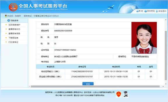 通过点击系统导航菜单的“打印准考证”选项,可进入准考证打印页面,如下