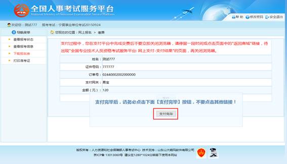 名表”选项,系统会提示“您未完成缴费不能下载报名表”,如下图所示:
