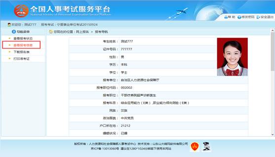 通过点击系统导航菜单的“查看报考信息”选项,可进入查看考生报考信息的