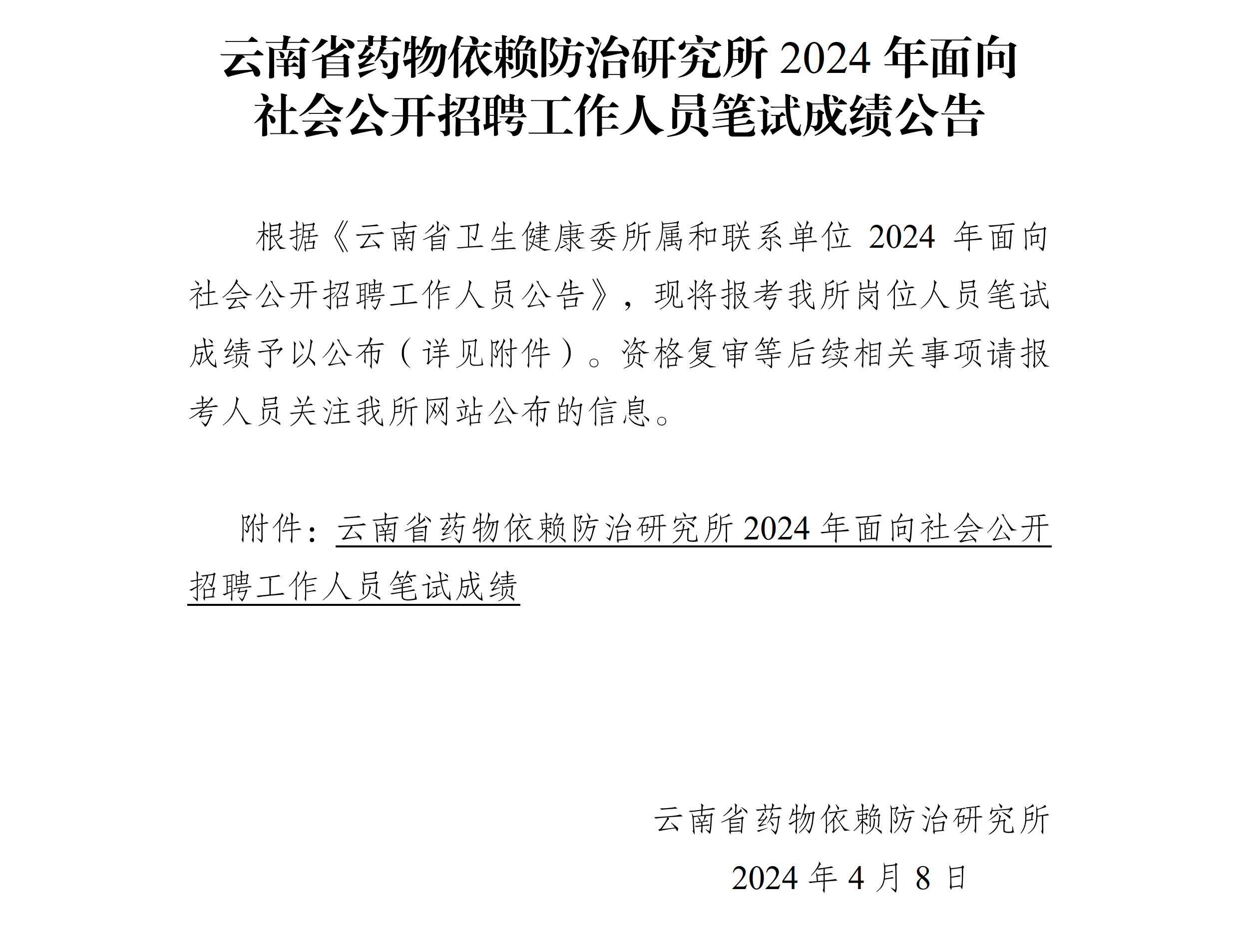 云南省药物依赖防治研究所2024年面向社会公开招聘工作人员笔试成绩公告