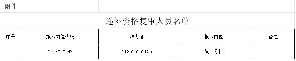 因有考生放弃资格复审,根据公务员考试录用有关规定,以进入该环节人员须具备的条件,按笔试成绩由高到低顺序,从报考同职位的考生中递补资格复审人员1名,递补资格复审人员名单见附件。
