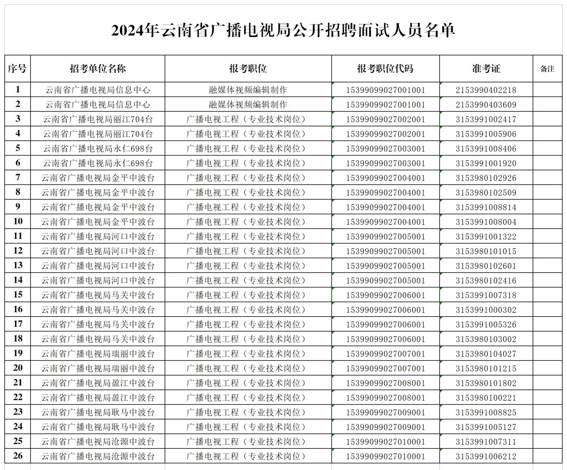 附件:2024年云南省广播电视局公开招聘面试人员名单