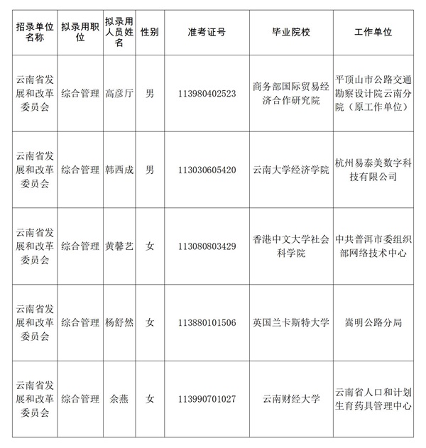 根据云南省2024年度考试录用公务员工作有关规定,经笔试、面试、体检、考察等程序,现将云南省发展和改革委员会2024年度考试录用公务员拟录用人员公示如下: