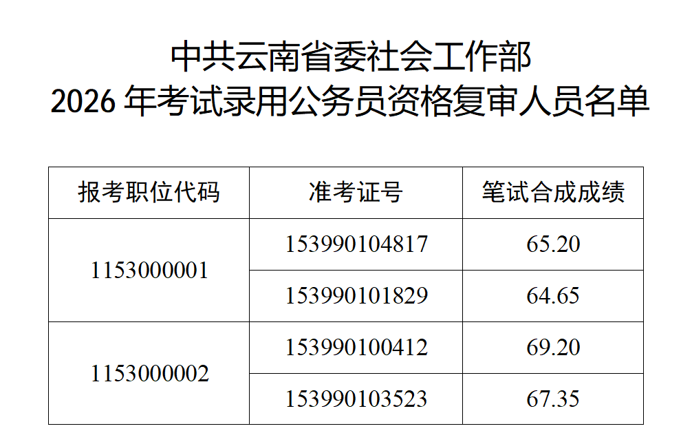 从报考中共云南省委社会工作部2026年考试录用公务员岗位,笔试成绩达到云南省2026年度考试录用公务员笔试合格分数线(省级机关职位)以上考生中,按不超过职位招录数2倍的比例和笔试成绩从高到低顺序,确定参加资格复审人员,名单附后。