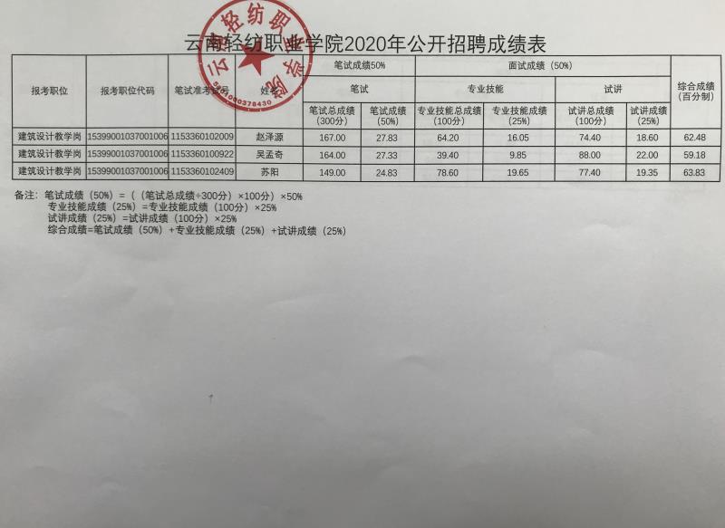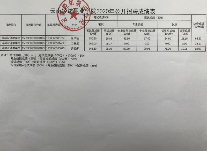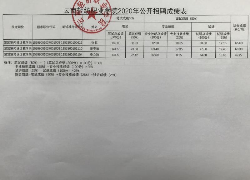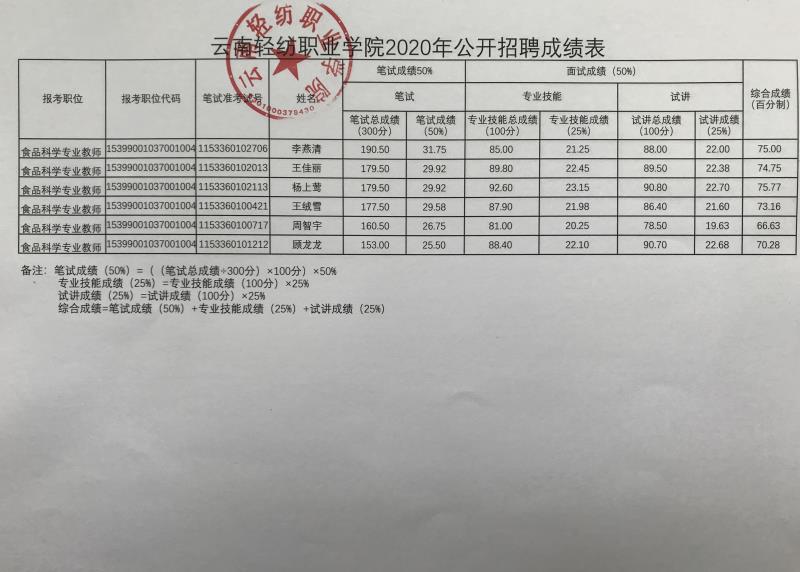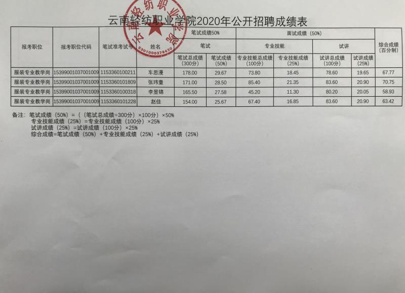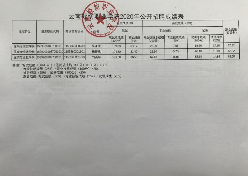 附件:云南轻纺职业学院2020年公开招聘成绩表