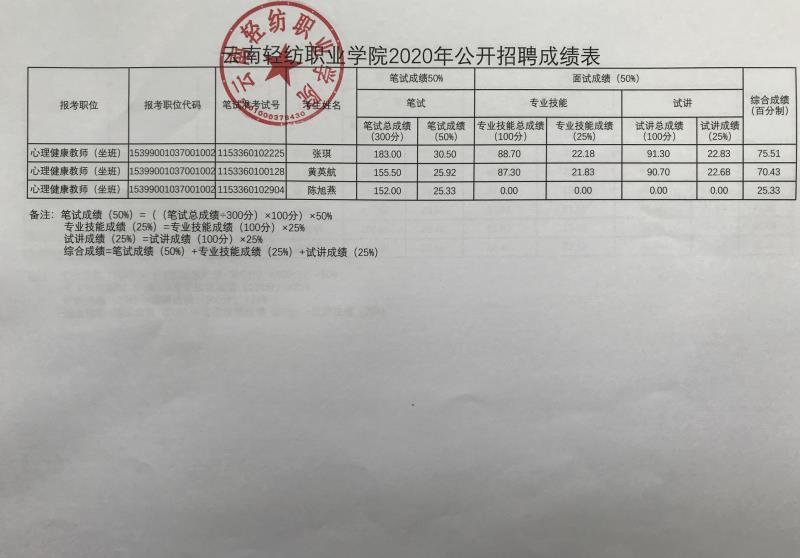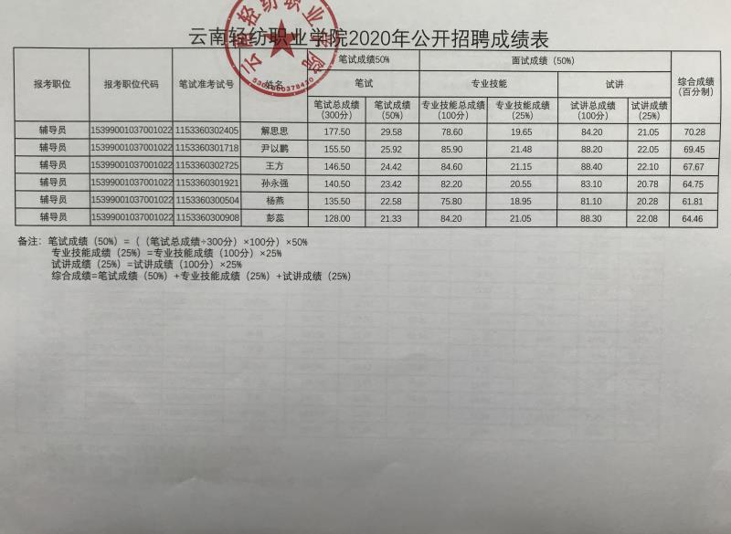 云南轻纺职业学院2020年第二批公开招聘事业单位工作人员于2020年9月12日完成了公开招聘的面试工作。根据《云南省事业单位公开招聘工作人员办法》(云人社发〔2016〕182号)和《云南轻纺职业学院2020年第二批公开招聘事业单位工作人员公告》等有关规定及相关要求,现将面试成绩及综合成绩公告如下(详见附件)。