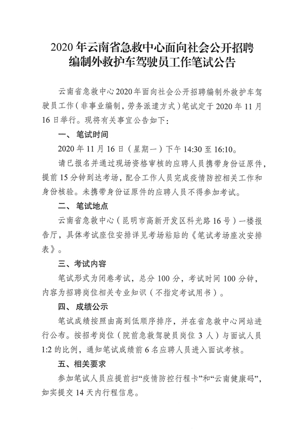 2020年云南省急救中心面向社会公开招聘编制外救护车驾驶员工作笔试公告