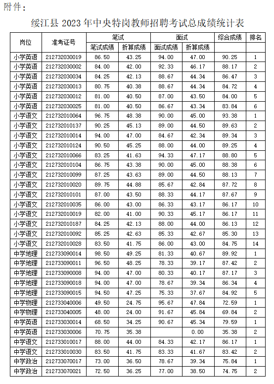 附件:绥江县2023年中央特岗教师招聘考试总成绩统计表
