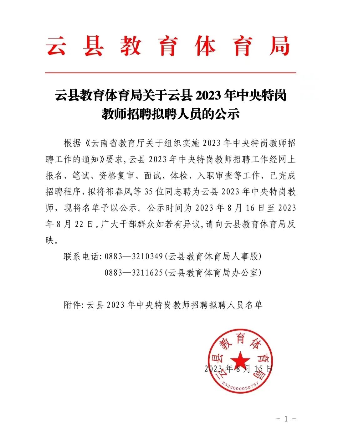 云县2023年中央特岗教师招聘拟聘人员的公示