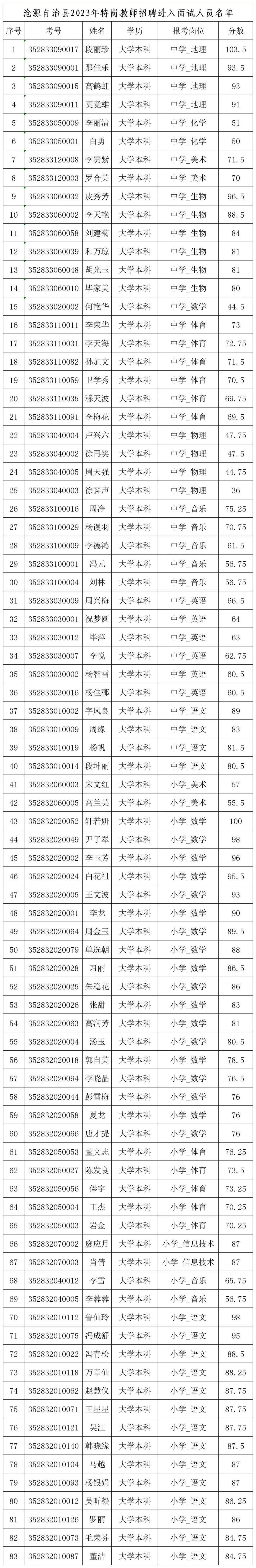 附件:沧源自治县2023年特岗教师招聘进入面试人员名单