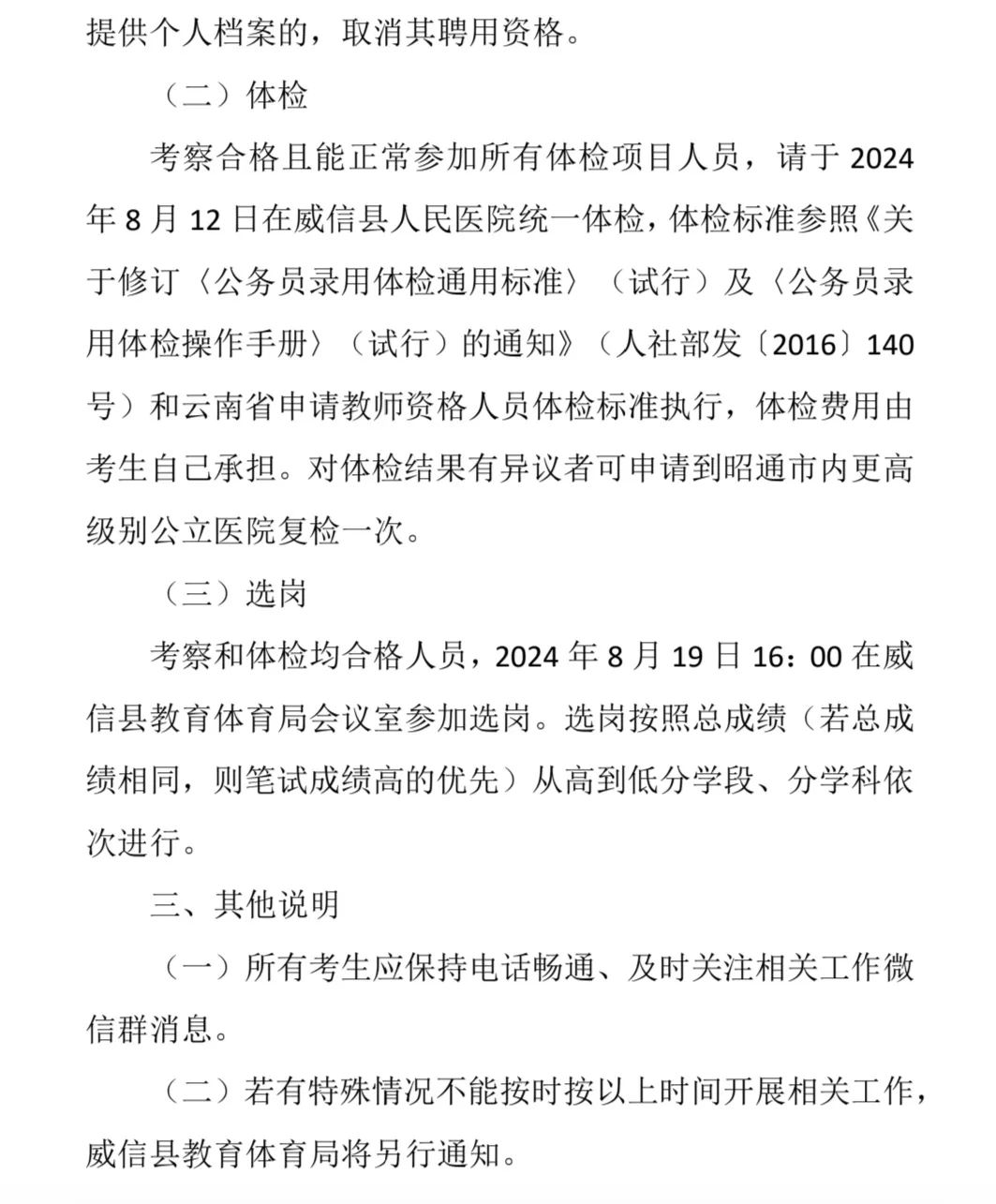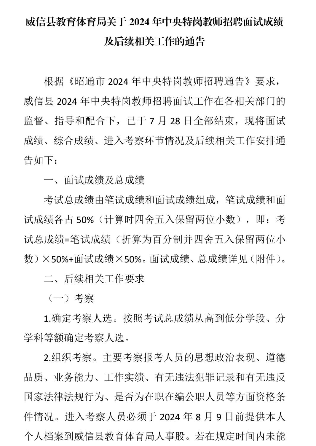 关于2024年中央特岗教师招聘面试成绩及后续相关工作的通告