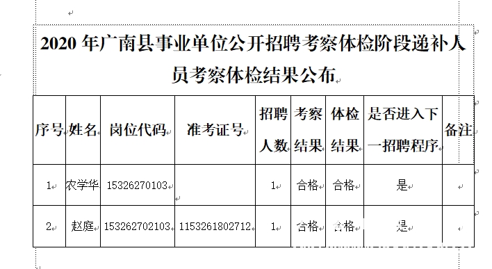 根据《2020年文山州事业单位公开招聘工作人员通告》有关规定和要求,我县2020年事业单位公开招聘考察体检阶段递补人员考察体检工作已结束,现将考察体检阶段递补人员考察体检结果公布如下: