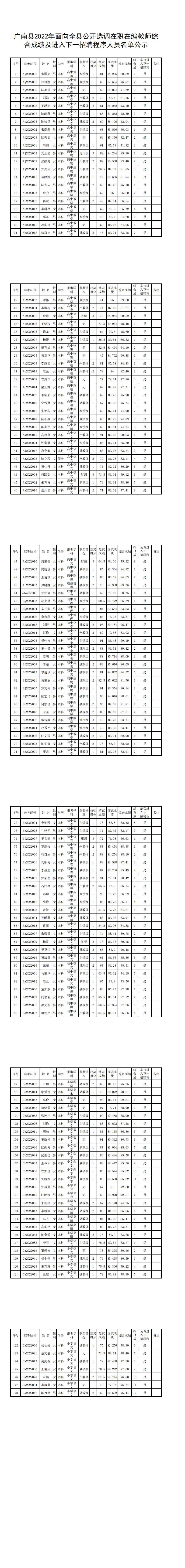 根据《广南县2022年面向全县公开选调在职在编教师方案》要求,通过笔试、面试,经县教体局党组研究,现将综合成绩及进入下一招聘程序的名单进行公示,公示期7天(2022年7月28日—8月3日),公示结束后,进入下一招聘程序的人员于2022年8月4日上午9:00到县教体局参加选岗,不参加选岗者,视为放弃,依次递补。若对公示人员有异议,请向广南县教育体育局人事股(联系电话:0876-5617943)、监审股(联系电话:0876-5154905)反映。