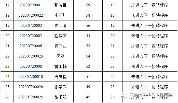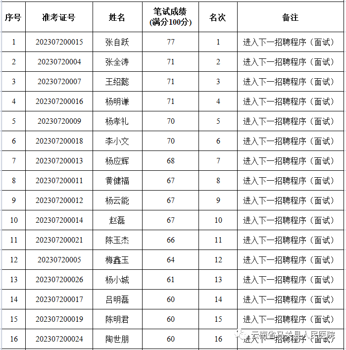 根据《2023年马关县人民医院编外护理人员招聘公告》精神,2023年7月20日,我院对参与报考人员进行了笔试,现将考试成绩予以公布如下。请笔试成绩60分及以上(第1名至第16名)的考生于2023年7月24日08:30到马关县人民医院门诊五楼会议室进入下一招聘程序(面试)。