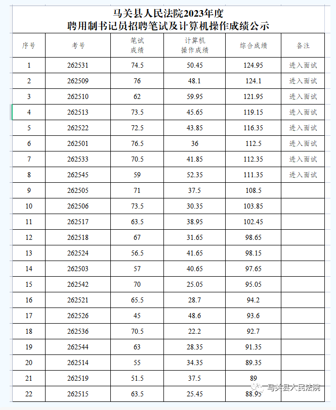 附:马关县人民法院2023年度聘用制书记员招聘笔试及计算机操作成绩
