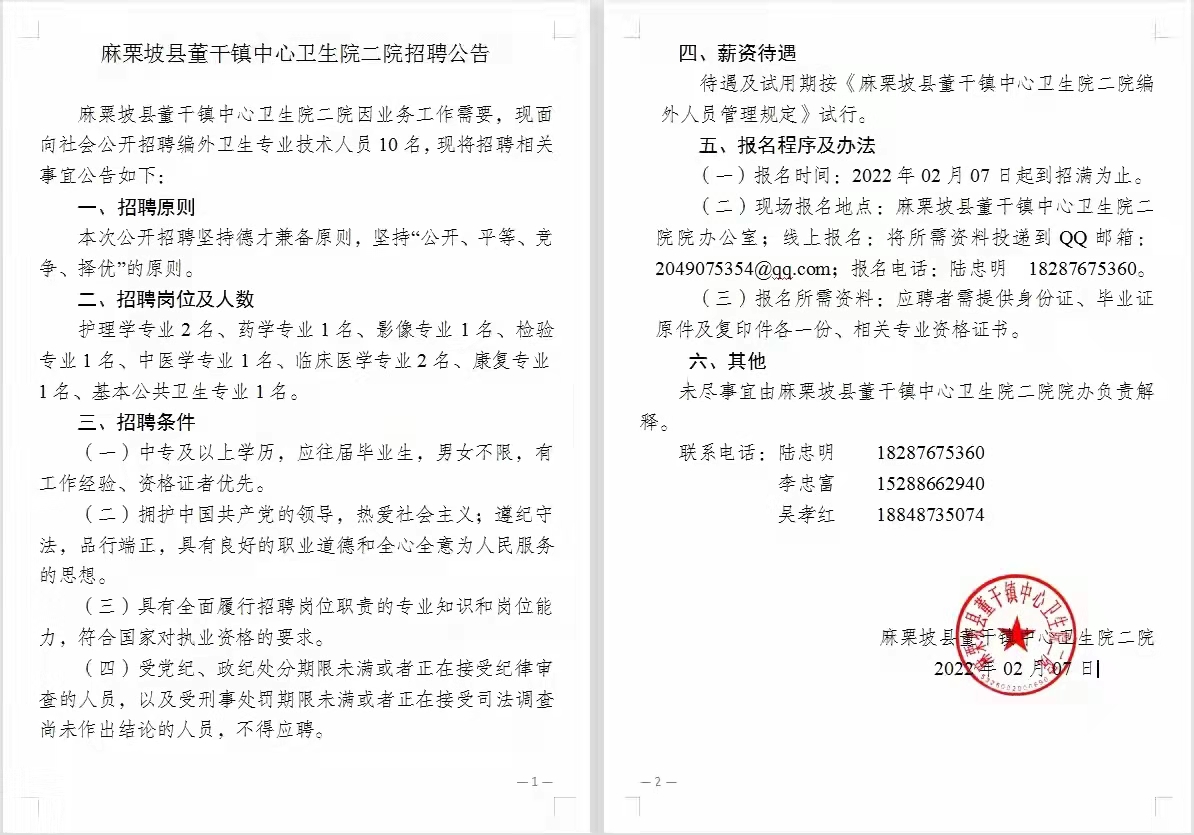 麻栗坡县董干镇中心卫生院二院因业务工作需要,现面向社会公开招聘编外卫生专业技术人员10名,现将招聘相关事宜公告如下:
