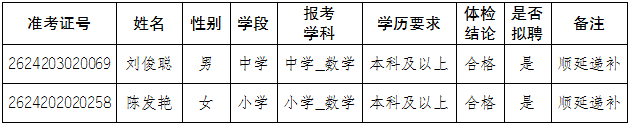 根据《文山州2020年特岗教师招聘公告》《麻栗坡县2020年特岗教师招聘面试公告》《麻栗坡县2020年特岗教师招聘综合成绩及拟聘人员体检事项公告》《麻栗坡县2020年特岗教师招聘拟聘特岗教师及选岗工作等调整相关事项公告》规定,因体检不合格1人,自愿放弃拟聘资格1人,顺延递补2人。现将顺延递补人员名单公告如下: