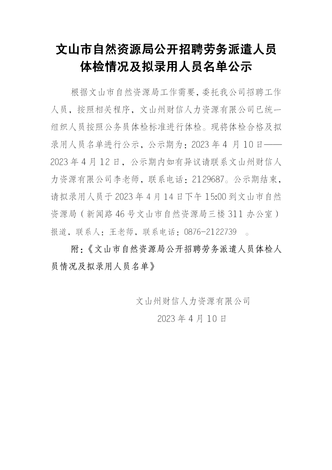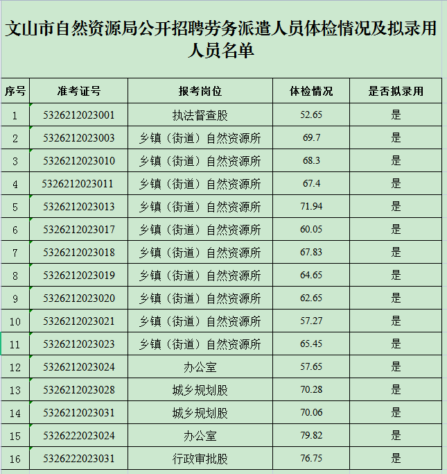 文山市自然资源局公开招聘劳务派遣人员体检情况及拟录用人员名单公示