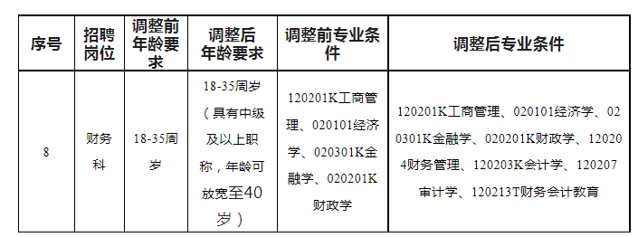 因财务岗位报名人员少,根据工作需要,经招聘工作领导小组研究决定,现就财务岗位招聘条件调整有关事项公告补充如下: