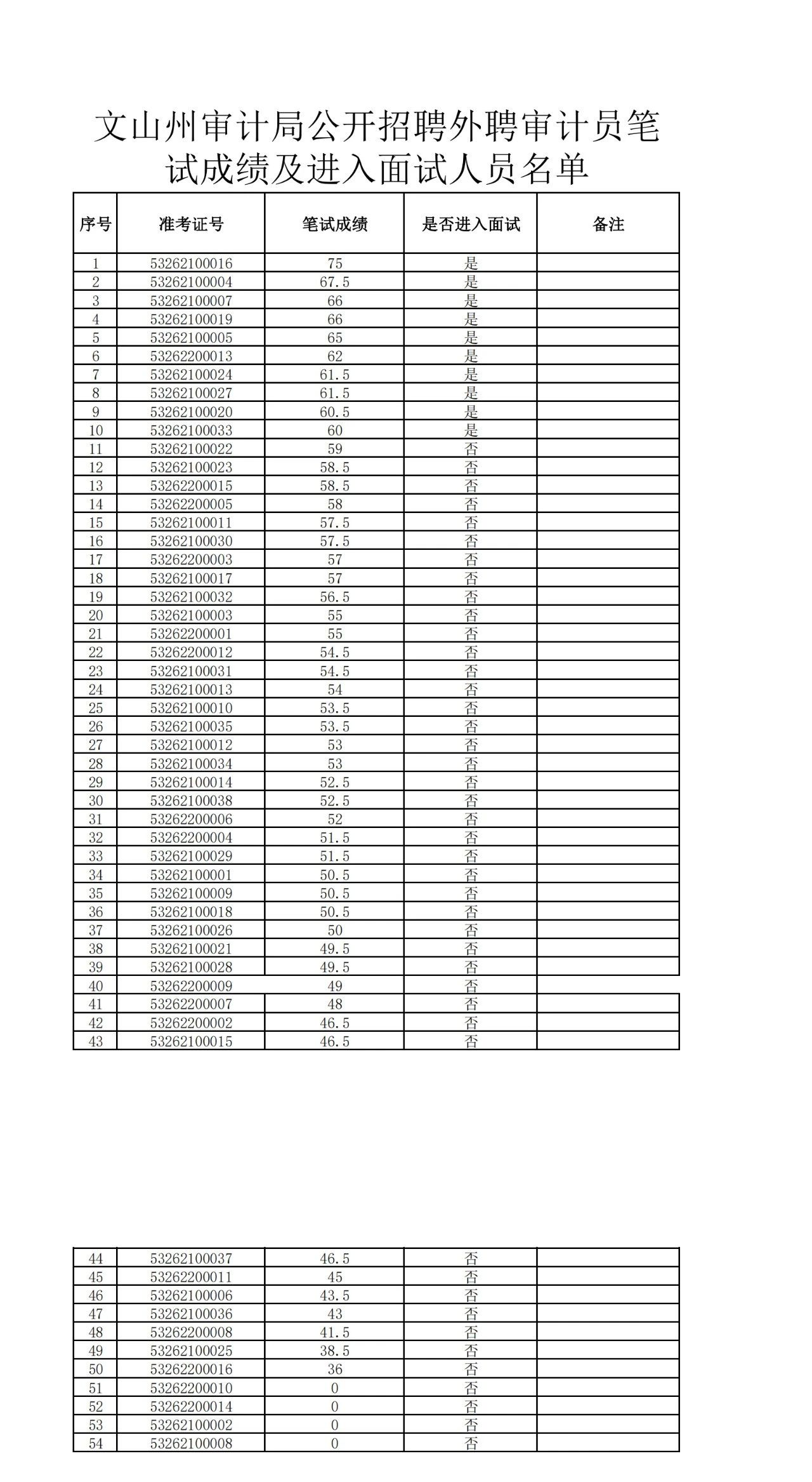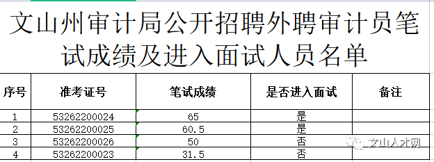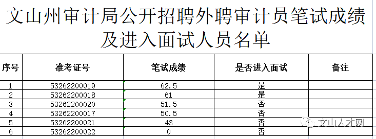 文山州审计局公开招聘外聘人员笔试成绩及进入面试程序人员名单公示