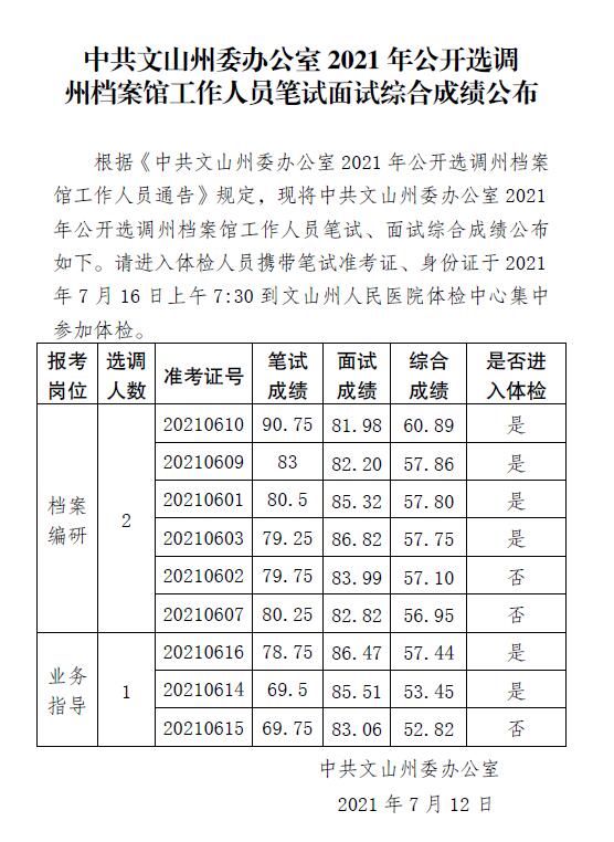 中共文山州委办公室2021年公开选调州档案馆工作人员笔试面试综合成绩公布