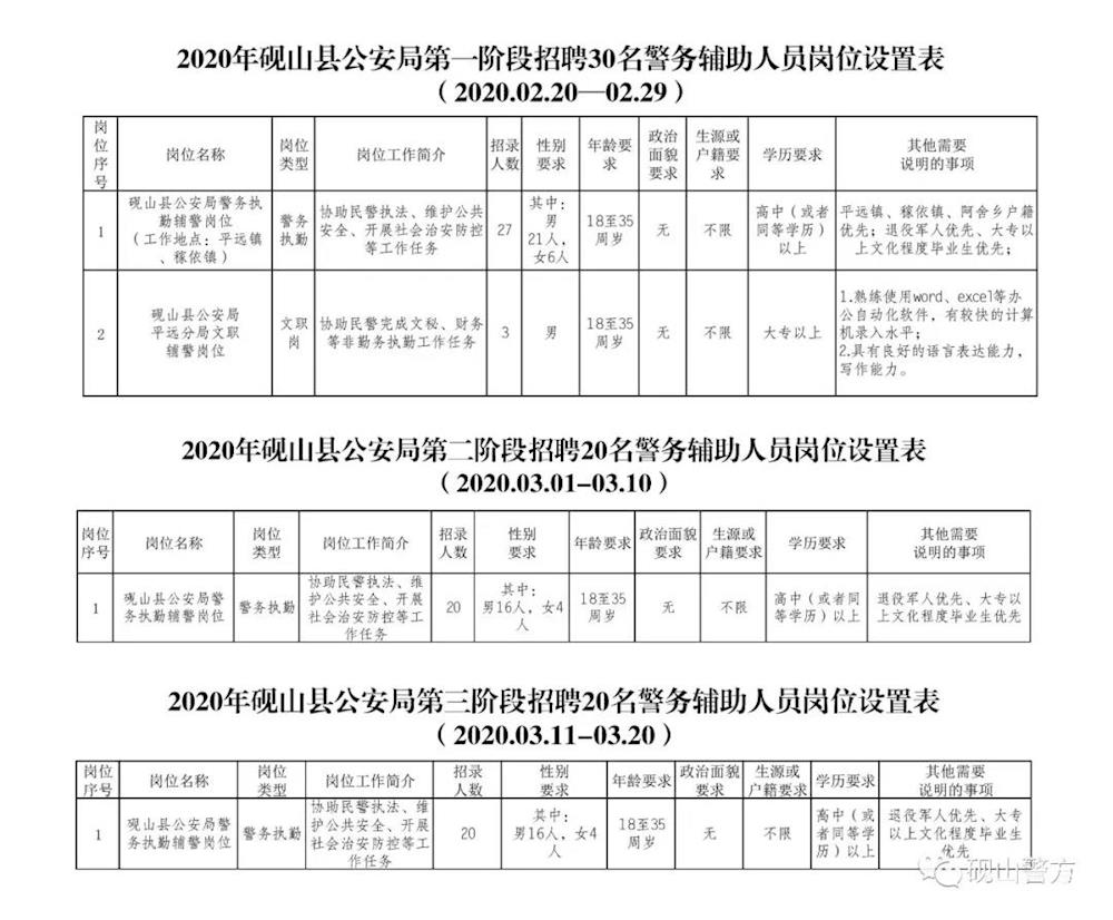 以上岗位设置详见砚山县公安局三个阶段招聘警务辅助人员岗位设置表