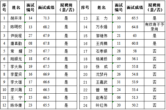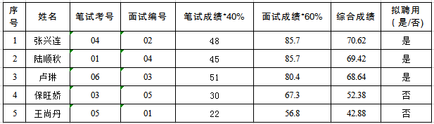 二、外勤岗面试成绩(从高到低排序,成绩不及格者不予录用)