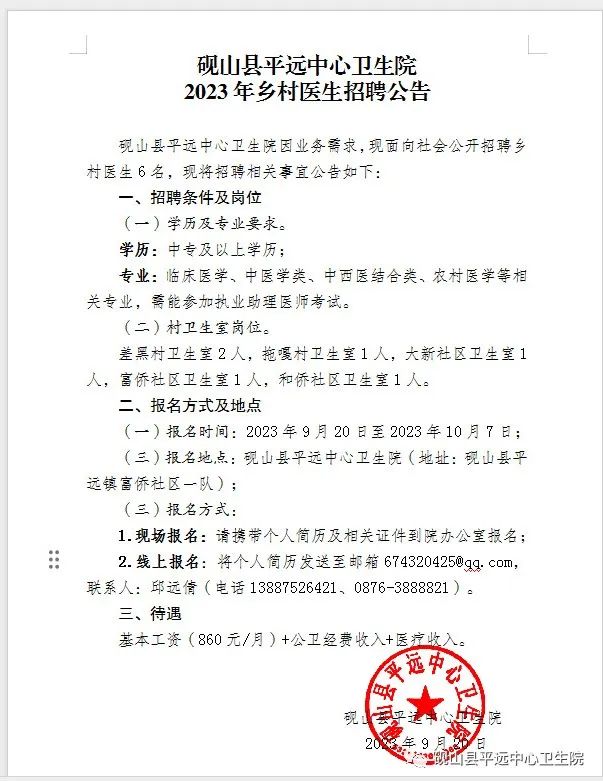 砚山县平远中心卫生院 2023年乡村医生招聘公告