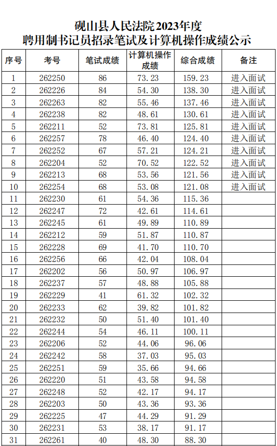 附:砚山县人民法院2023年度聘用制书记员招聘笔试及计算机操作成绩
