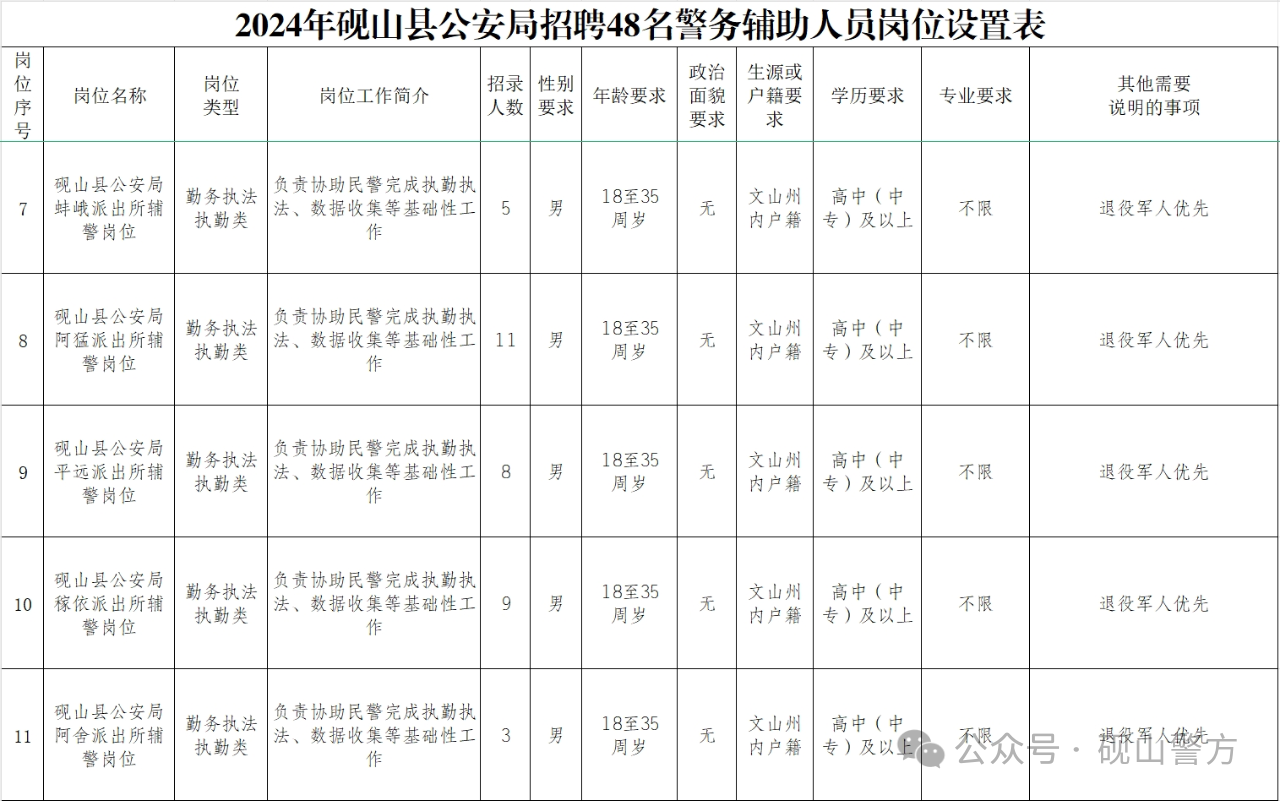 砚山县公安局此次面向社会公开招聘辅警59名。招聘岗位及人数详见《砚山县公安局招聘警务辅助人员岗位设置表》。