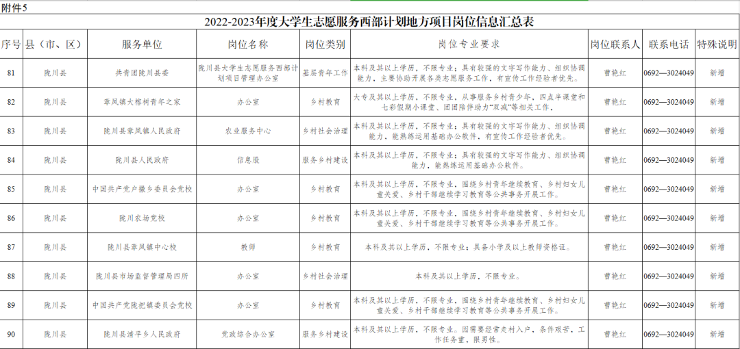 2022-2023年度陇川县大学生志愿服务西部计划地方项目拟新招募志愿者10名,为方便报名人员提前选择合适岗位,现将岗位表公布如下:
