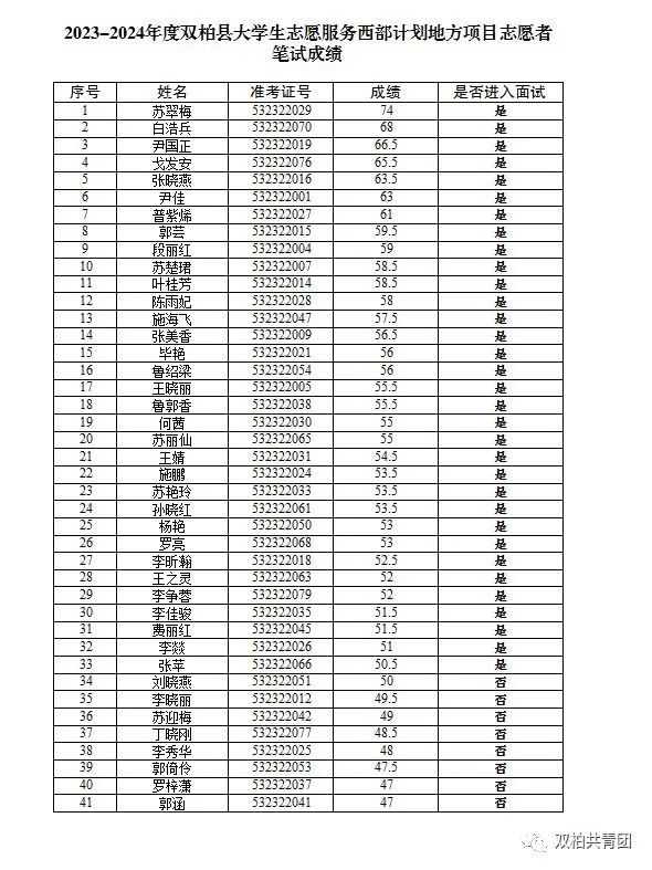 根据楚雄州大学生志愿服务西部计划项目管理办公室《关于做好2023-2024年度楚雄州大学生志愿服务西部计划省级地方项目志愿者招募派遣工作的通知》要求,双柏县项目办于2023年6月29日统一组织了志愿者笔试,并根据成绩从高到低按照1:3的比例确定前33名考生进入面试,现将笔试成绩及面试安排公告如下: