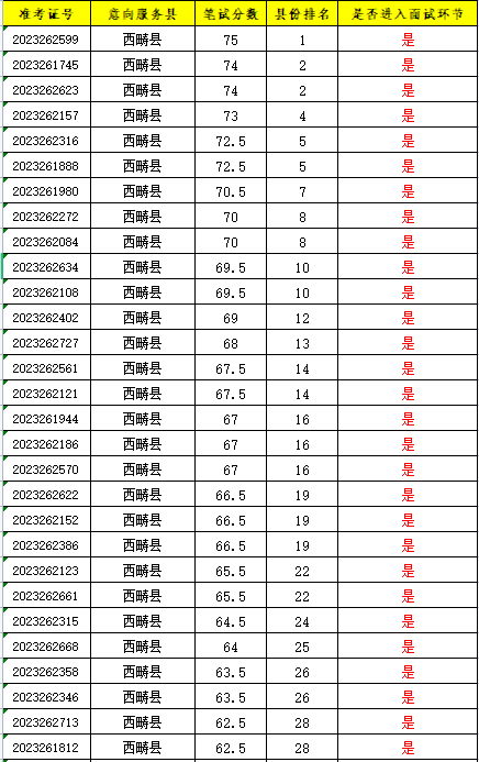 报考西畴县2023年—2024年度服务西部计划地方项目志愿者,符合报考条件并通过资格复审的人员。根据笔试成绩从高到低的原则,按照招募人数和笔试人数1:2的比例确定岗位面试人员。(最后进入面试的排序中笔试成绩并列的,同时进入面试。)