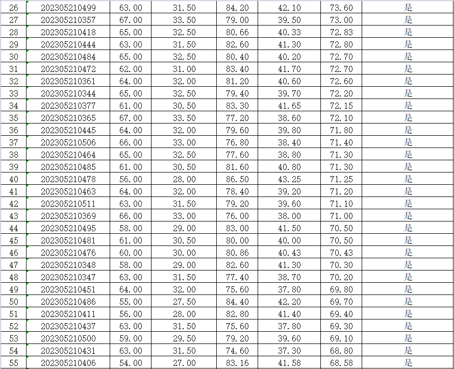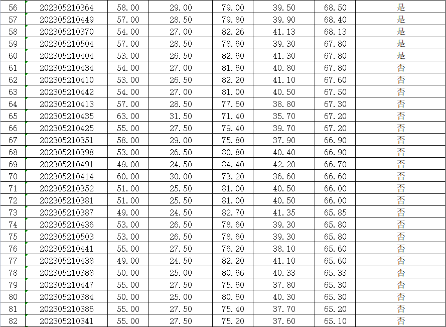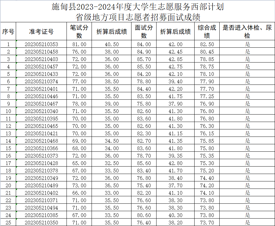 特别说明:因部分考生综合成绩相同,根据《施甸县2023—2024年度大学生志愿服务西部计划省级地方项目志愿者面试办法》规定,综合成绩排名方法:综合成绩相同的,按中共党员(含预备党员)、少数民族、优秀学生干部及获奖情况排序,如再仍无法排序的,则按其报名顺序排序。