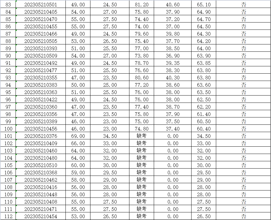 根据《共青团中央、教育部、财政部、人力资源和社会保障部关于印发<2023-2024年度大学生志愿服务西部计划实施方案>的通知》(中青联发〔2023〕6号)及《共青团云南省委、省教育厅、省财政厅、省人力资源和社会保障厅关于印发<2023-2024年度云南省大学生志愿服务西部计划实施方案>的通知》(云青联〔2023〕10号)文件精神,施甸县2023—2024年度计划招录大学生志愿服务西部计划省级地方项目志愿者60名。7月4日,县项目办统一组织面试,按照《施甸县2023—2024年度大学生志愿服务西部计划省级地方项目面试公告》,笔试排名1—122名的考生进入面试,实际面试100人,弃考22人。现对面试成绩及最终成绩公示如下。