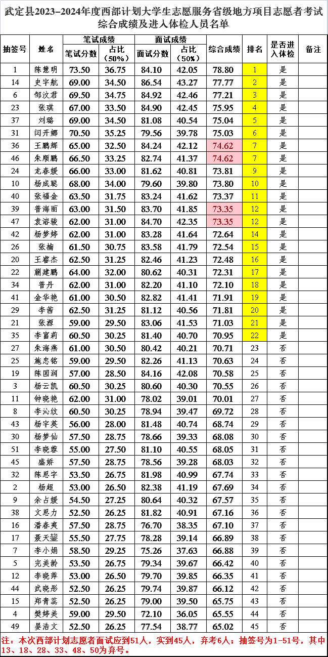 根据《武定县2023—2024年度大学生志愿服务西部计划省级地方项目志愿者招募公告》的相关要求,武定县2023-2024年度大学生志愿服务西部计划地方项目志愿者招募考试工作已经结束,各报考人员综合成绩的计算方法是:综合成绩=笔试成绩×50%+面试成绩×50%。笔试、面试均采取百分制计分,综合成绩保留小数点后2位。现将武定县2023-2024年度西部计划大学生志愿服务省级地方项目志愿者考试综合成绩及进入体检人员名单公告如下(名单附后),武定县项目办将组织综合成绩排名前22名的考生参加体检等后续工作,如有考生放弃或志愿者离岗,共青团武定县委将按综合成绩排名高低依次递补。