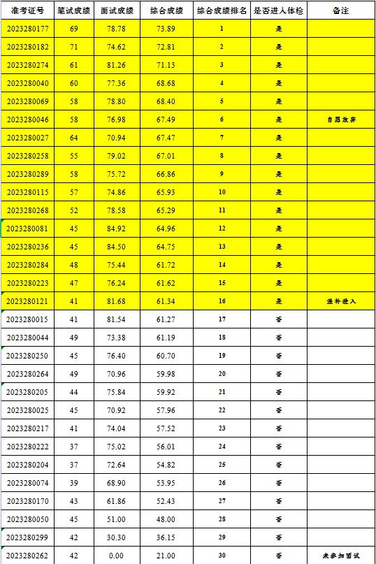 勐海县2023—2024年度大学生志愿服务西部计划地方项目招募拟进入体检人员名单根据报考者综合成绩从高到低的顺序,按招募岗位1:1的比例来确定(综合成绩计算方法:综合成绩=笔试成绩50%+面试成绩50%)。名单如下: