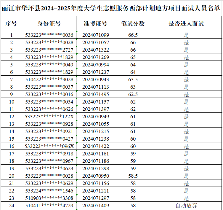 根据丽江市西部计划项目办关于开展2024-2025年度云南省大学生志愿服务西部计划省级地方项目的有关要求,按报考岗位根据笔试成绩从高到低的顺序,以招考计划数1:2的比例,确定参加面试人选,现将面试有关事项公告如下: